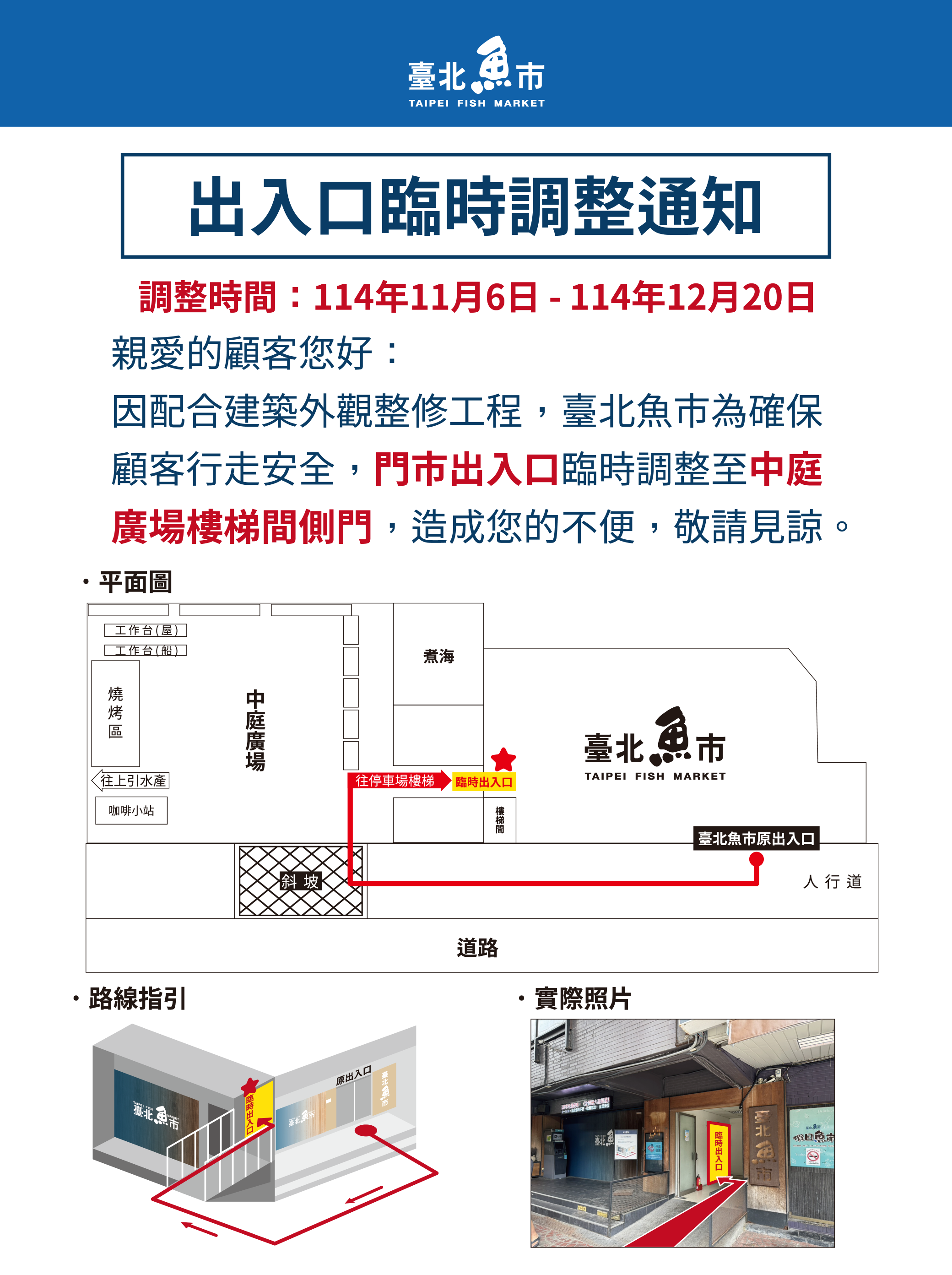 【門市出入口臨時調整通知】 調整時間:114年11月6日 - 114年12月20日 親愛的顧客您好 因配合建築外觀整修工程,臺北魚市為確保顧客行走安全,門市出入口臨時調整至中庭廣場樓梯間側門,造成您的不便,敬請見諒。
